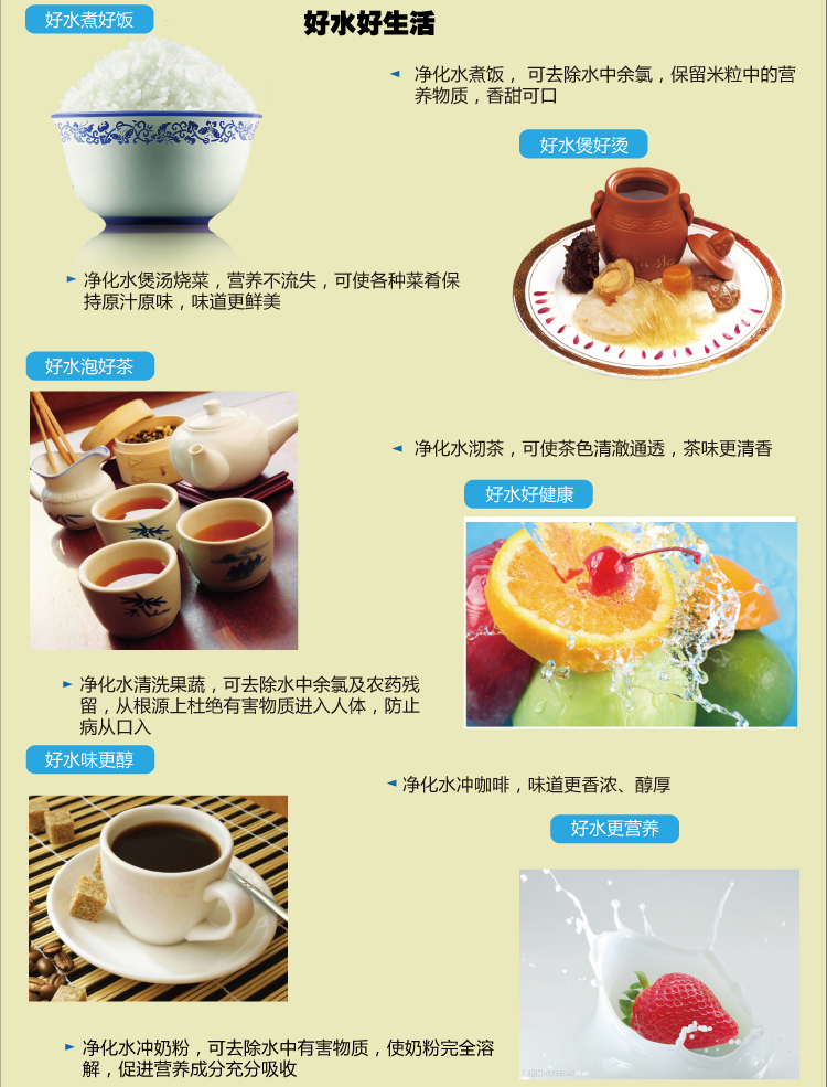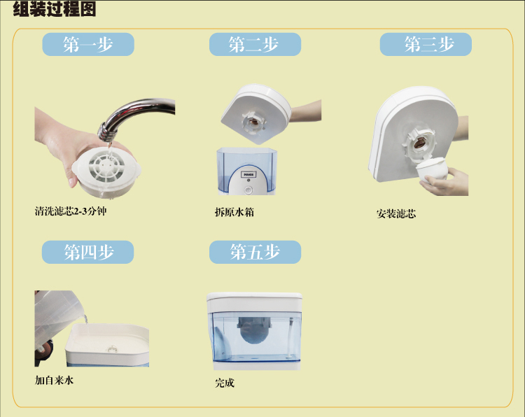2. 每次烧开的水可以接到3杯250ml开水 3. 水龙头有水流出时才能插上电源,以免烧坏加热部件 |